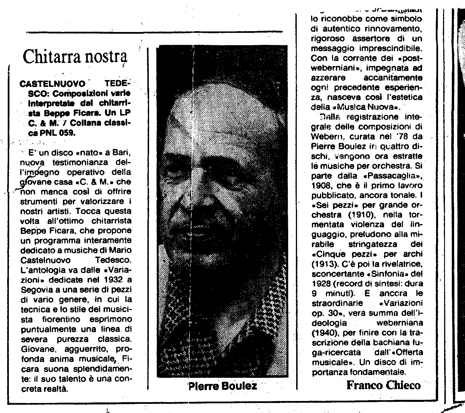 « Al giovane chitarrista Beppe Ficara va il merito di aver scelto, per questa sua incisione, non solo le composizioni più note e pluriincise, come la trascinante Tarantella o la Tonadilla sul nome di Andres Segovia, ma tutta una serie di pagine che prima d'ora non erano mai state affidate al disco. Ficara affronta il programma, spesso arduo, forte di una solida tecnica strumentale e di una notevole sensibilità interpretativa (...). Si tratta di un elegante omaggio alla memoria di un maestro cui la chitarra e i chitarristi d'oggi devono parecchio da parte di un esecutore di livello egregio ».